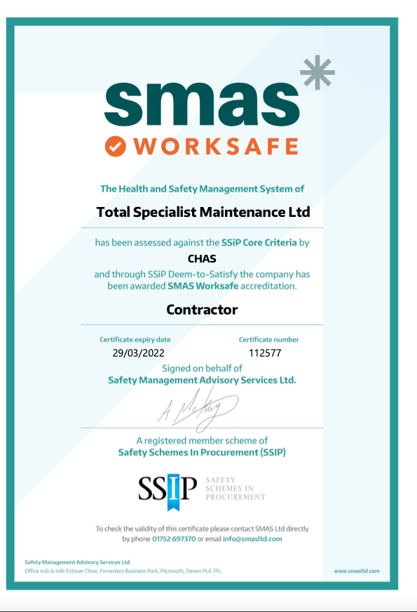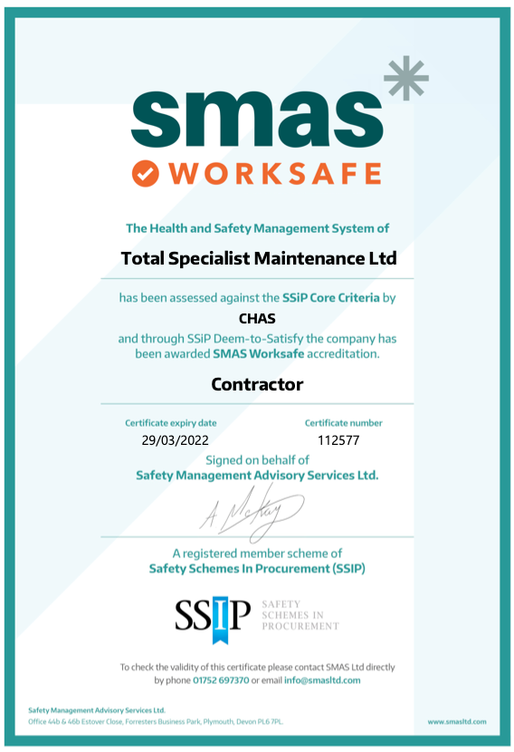 TSM Media Team We have our SMAS worksafe Accreditation Total Specialist Maintenance is really pleased to achieve our SMAS Worksafe Accreditation Once again, a great team effort – and another one to add to our growing list of accreditations. Tags: Accreditations