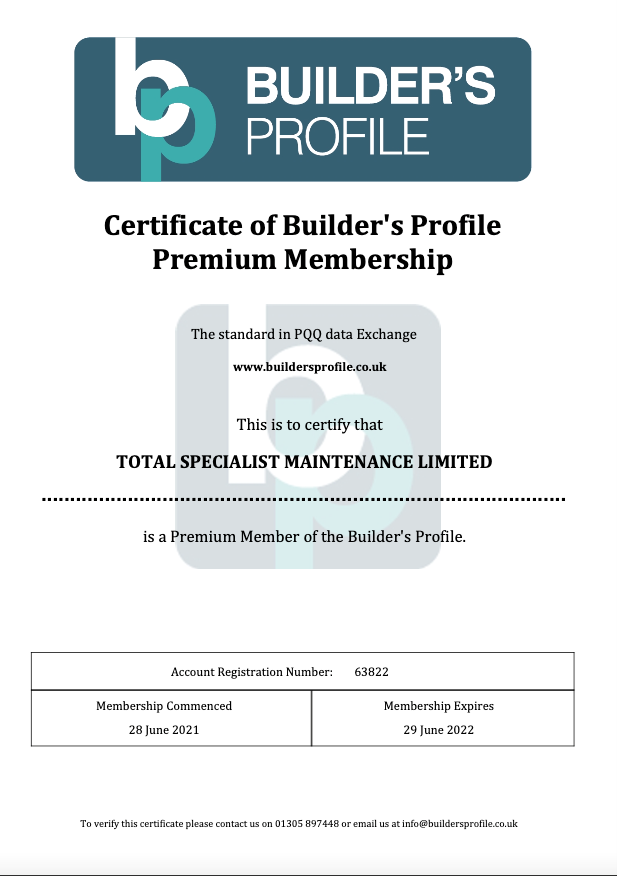 TSM Media Team We have achieve our Builders profile Premium membership Total Specialist Maintenance is really pleased to achieve our Builders profile Premium membership Once again, a great team effort – and another one to add to our growing list of accreditations. Tags: Accreditations
